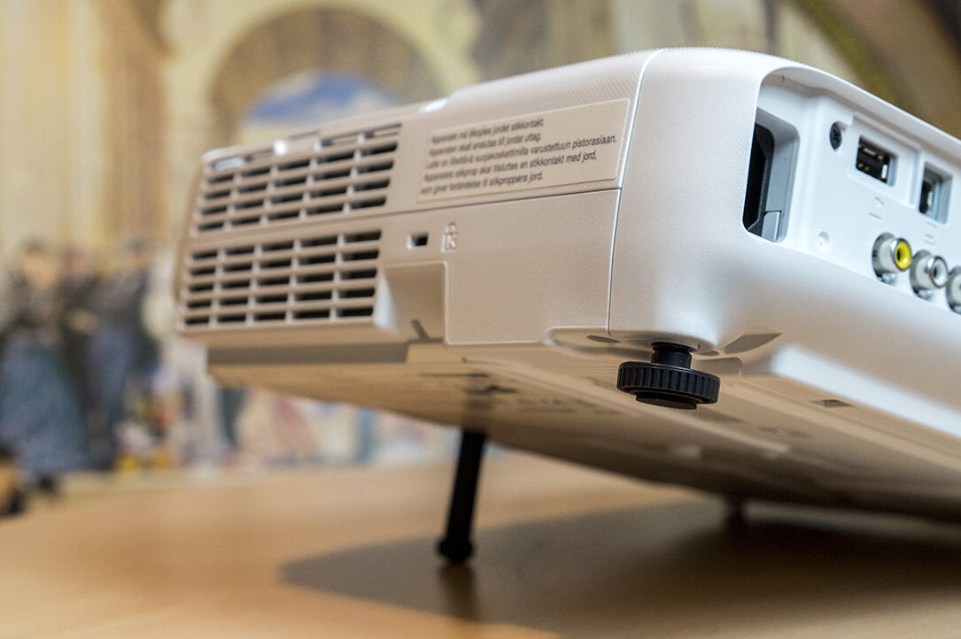 An der Unterseite befindet sich vorne ein auf Knopfdruck ausfahrender Fuß, um das Projektionsgerät in der Vertikalen ausrichten zu können. Die Abstände, in denen der Fuß einrastet, sind leider relativ groß geraten, wodurch man oft gezwungen ist, mit den hinteren, schraubbaren Justierfüßen gegenzusteuern, sofern man eine Leinwand zentimetergenau treffen möchte.