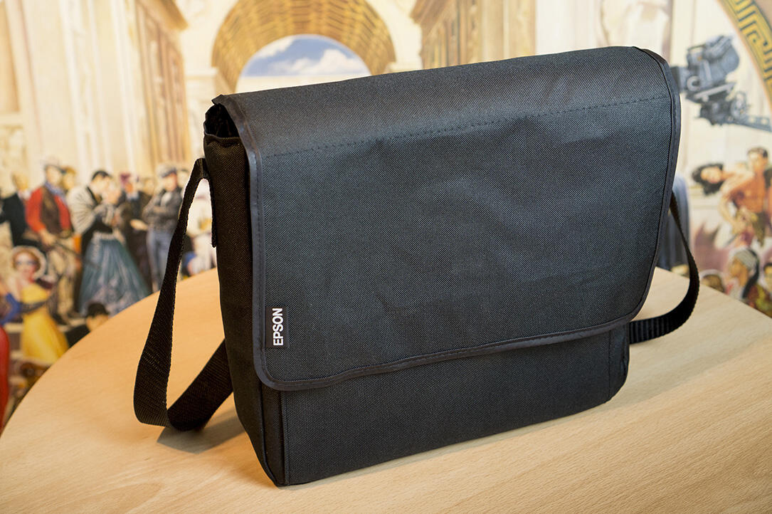 Der Beamer kommt zusammen mit einer formschönen, gepolsterten Tasche, die außen aus wasserabweisendem Stoff gefertigt wurde. Neben einem zweiten Fach für das Zubehör wurde noch ein längenverstellbarer Gurt angebracht.