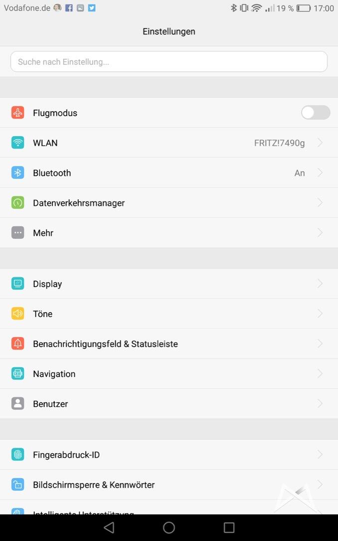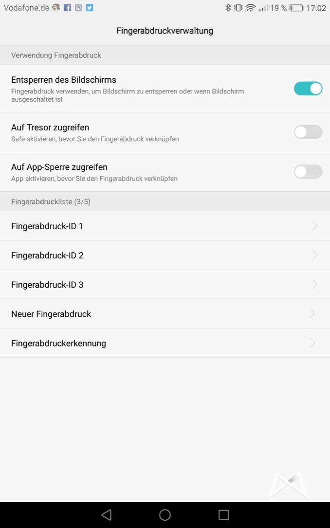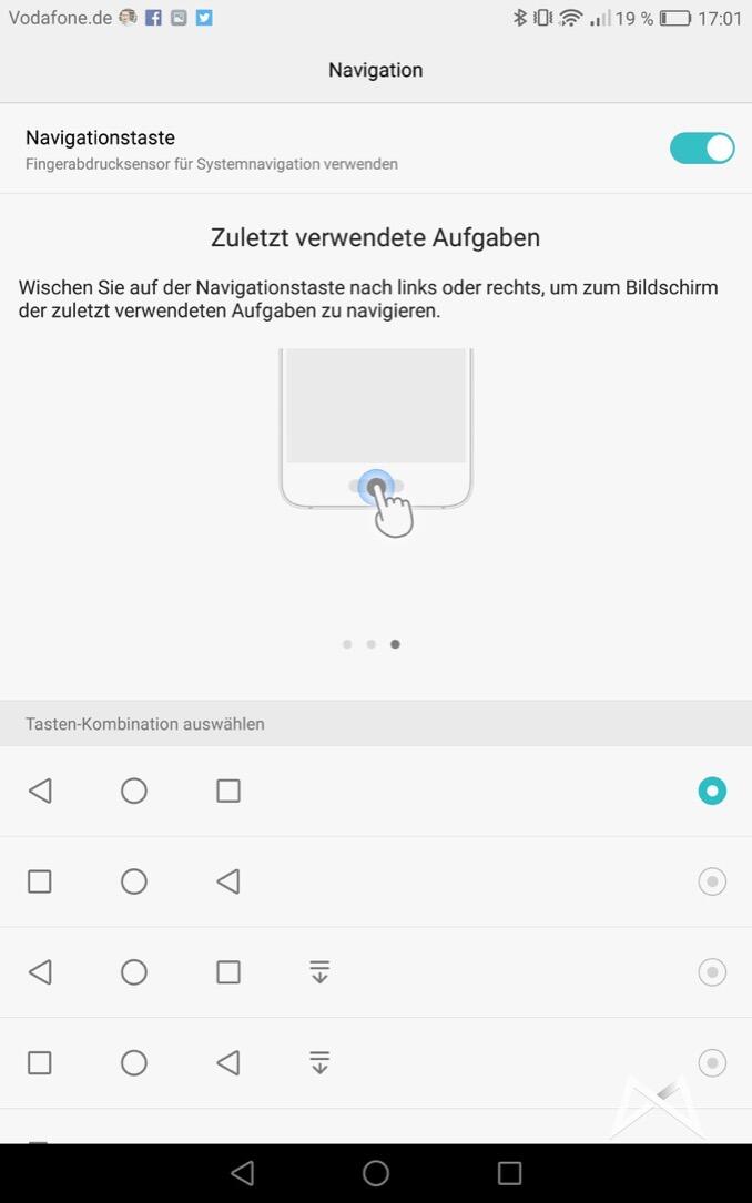 Auf der Front unterhalb des Displays ist zudem der Fingerabdrucksensor integriert. Der Sensor ist wie es der Name schon sagt, ein Sensor und kein Button, welcher lediglich auf Berührung reagiert und nicht gedrückt werden muss. Er reagiert super schnell und bekam von Hauwei auch noch eine Gestenunterstützung spendiert. Wischt man beispielsweise seitlich über den Sensor werden die zuletzt genutzten Apps dargestellt.