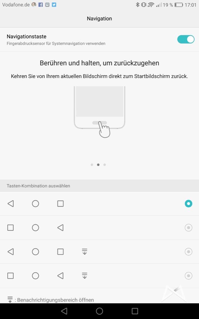 Auf der Front unterhalb des Displays ist zudem der Fingerabdrucksensor integriert. Der Sensor ist wie es der Name schon sagt, ein Sensor und kein Button, welcher lediglich auf Berührung reagiert und nicht gedrückt werden muss. Er reagiert super schnell und bekam von Hauwei auch noch eine Gestenunterstützung spendiert. Wischt man beispielsweise seitlich über den Sensor werden die zuletzt genutzten Apps dargestellt.