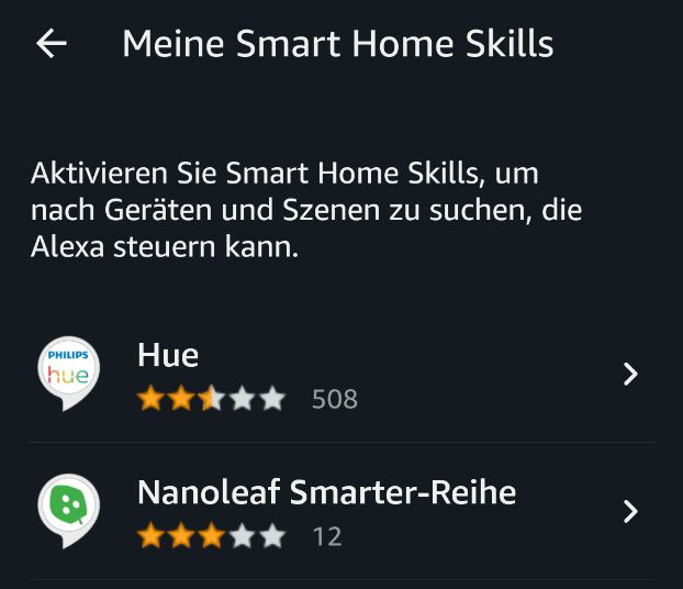 Im Idealfall sollte anschließend das Nanoleaf-Modul gefunden werden und eine Steuerung möglich sein. Tatsächlich brauchte ich aber insgesamt acht Anläufe mit Deaktivierung und neuer Kopplung bis die Verknüpfung schließlich klappte. Dann tauchte Nanoleaf endlich in der Alexa-App auf und war auch per Sprache steuerbar.