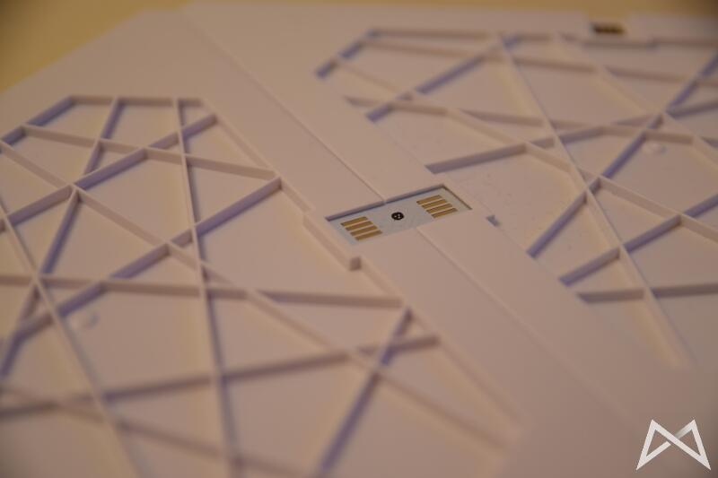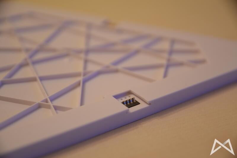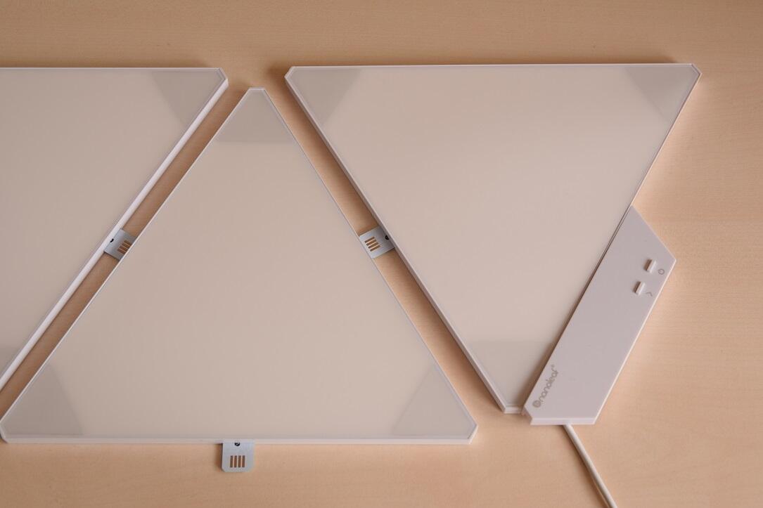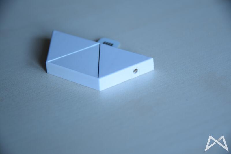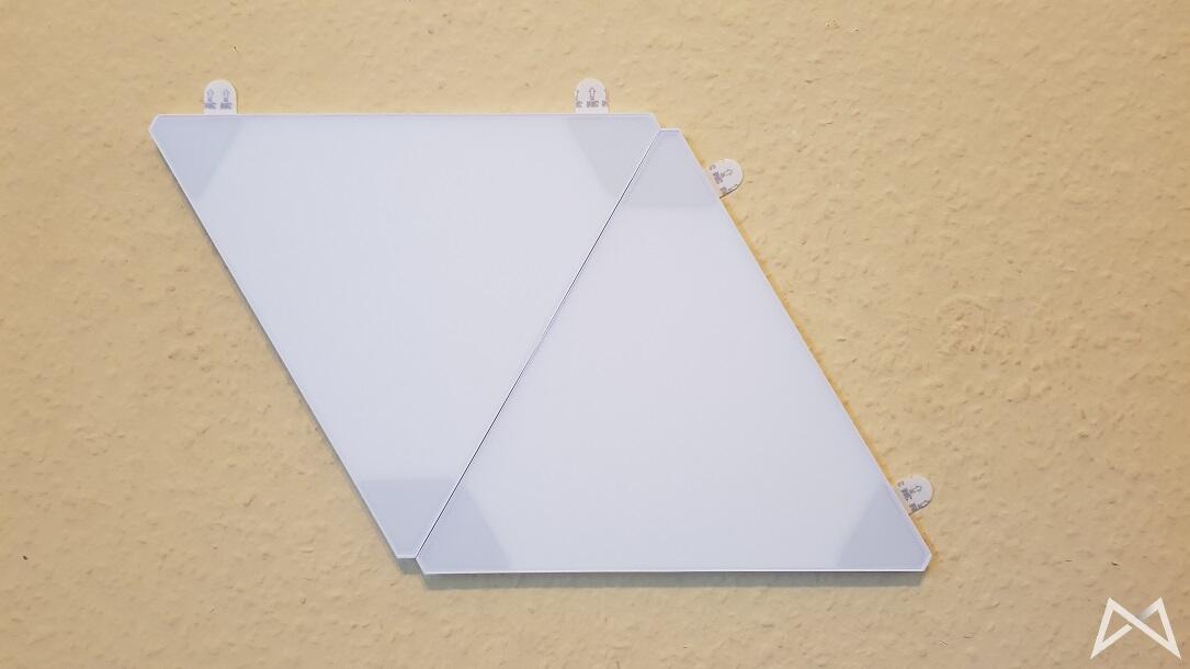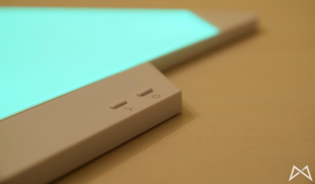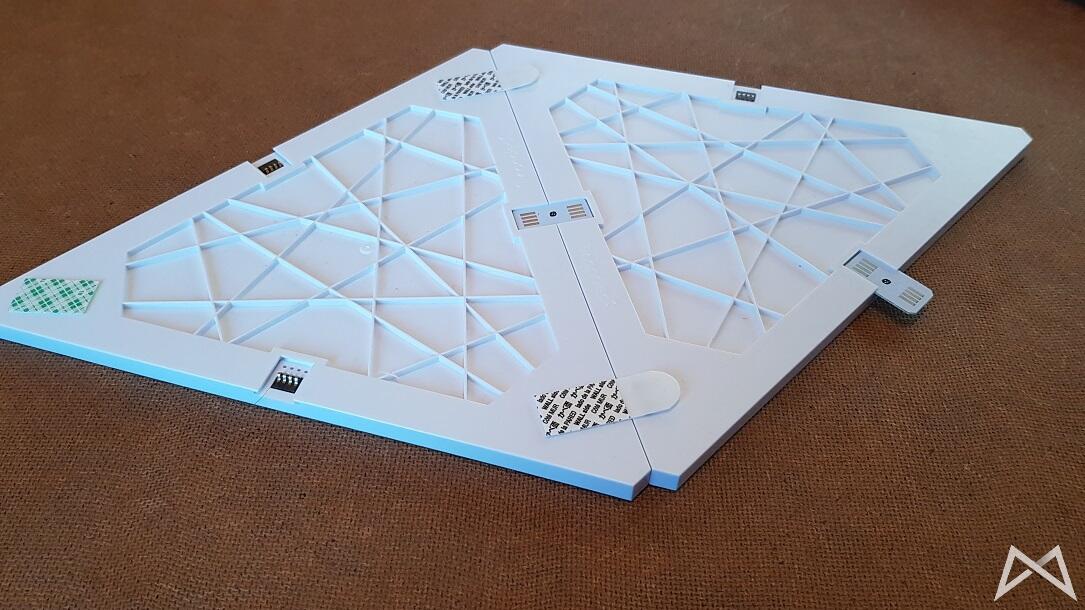 Mit 25cm Kantenlänge fallen die eigentlichen Panels deutlich größer aus, als ich sie mir vorgestellt hätte. Im ausgeschalteten Zustand erstrahlen sie schön weiß. Vorderseitig bestehen sie aus einer matten Kunststoffbeschichtung, welche sehr empfindlich für Kratzer sein dürfte. Insgesamt wirken die Panels auch durch das hohe Gewicht von 200 Gramm hochwertig verarbeitet und weisen keine unterschiedlichen Spaltmaße auf.