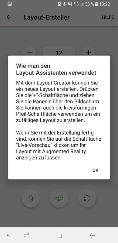 Die App leitet dann direkt zu einem ersten Tutorial über, welches die ersten Schwächen der Software offenbart. Eigentlich sollte eine erste Einführung in die App gegeben werden, was anfangs auch ganz gut klappte. Als der Layout-Assistent erklärt wird, bleibt die eigentliche App im Hintergrund jedoch schwarz und es erscheint nur der Tutorial-Text. Das ist aber kein großes Problem, denn nach einem Neustart funktionierte die App wieder.
