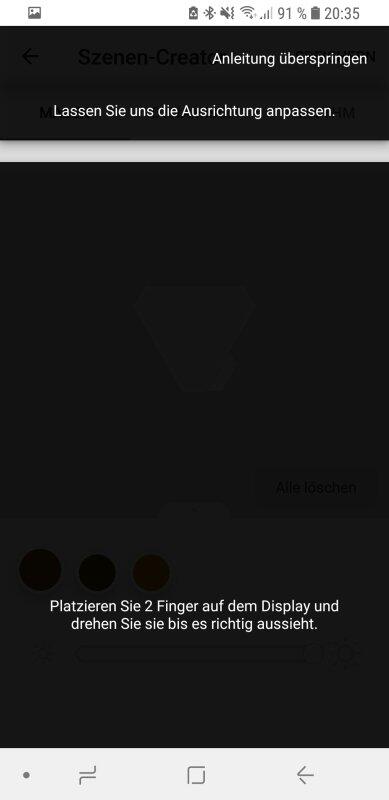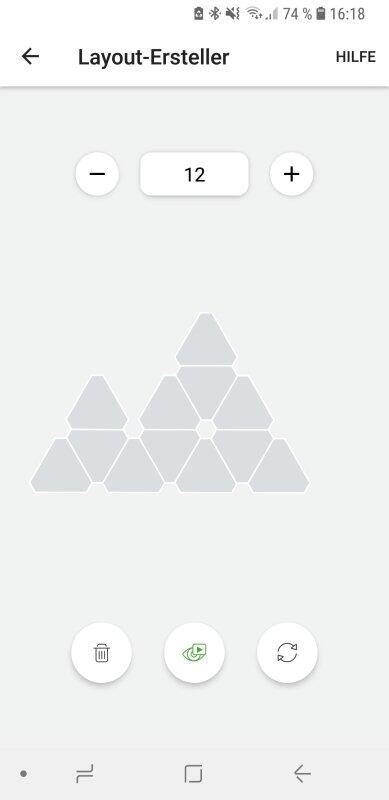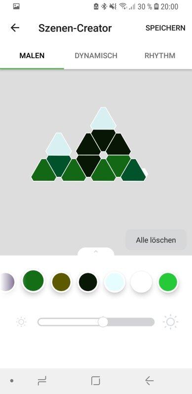 Die Farben müssen im Schritt zuvor festgelegt werden, werden dort aber noch nicht auf den Panels selbst angezeigt. Der Szenen-Editor ist hingegen in Echtzeit mit den Panels gekoppelt – die Vorschau der Beleuchtung gibt es also nicht nur in der App, sondern gleichzeitig direkt auf Nanoleaf. Allerdings weichen die Farben zwischen App und Realität stark ab. So musste ich die meisten Farben dann nochmals einzeln austauschen und das Erstellen meiner Wunsch-Szene mit Bergmotiv hat 10 Minuten und einigen Frust gekostet.