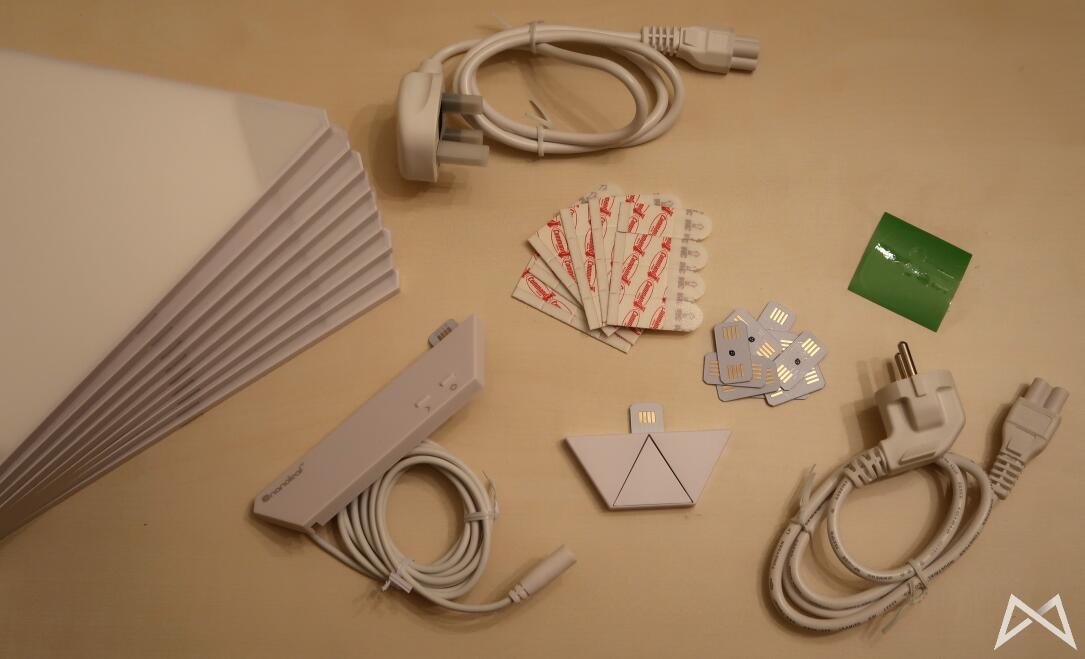 Zumindest einige Punkte davon sollten selbsterklärend sein. Da Nanoleaf anscheinend nur Set für ganz Europa vertreibt, wird auch ein Stromstecker mit UK-Anschluss mitgeliefert. Das Stromkabel wird dann mit dem eigentlichen Netzteil (dicker Klotz oben im Karton) verbunden und dieser wiederum per Kabel mit dem eigentlichen Steuermodul.