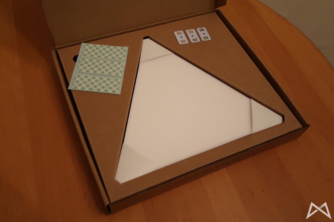 Interessant ist die doppelte Funktion der Schutzpapiere. Zum einen sorgen sie dafür, dass die Panels beim Transport nicht verkratzen. Gleichzeitig können sie aber auch als Schablonen für die spätere Anordnung der Lichter an der Wand dienen – sie fallen nämlich genau so groß aus wie die Panels selbst. Dazu aber später mehr, wenn es an die Einrichtung geht.