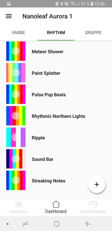 Auch ohne diese Anleitung ist die Bedienung größtenteils selbsterklärend. Für das Rhythm-Modul gibt es ebenfalls verschiedene Szenen, von denen einige vorinstalliert sind und sich weitere selbst erstellen oder herunterladen lassen. In der App kann dann zwischen Rhythm-Szenen und normalen (dynamischen oder statischen) Szenen umgeschaltet werden.