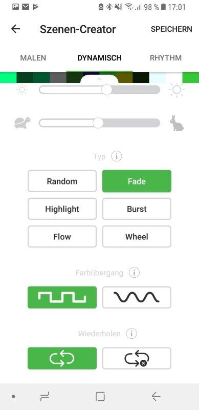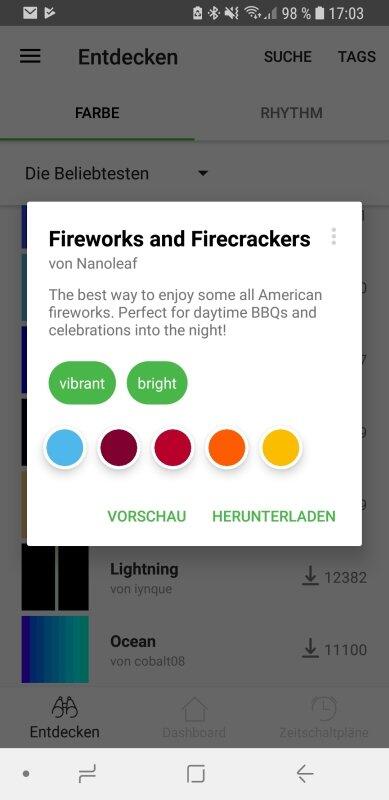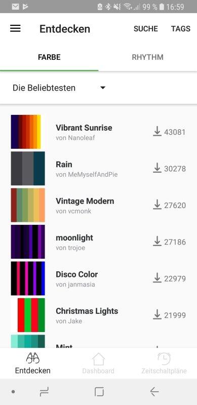 Ansonsten tut die App das, was sie soll. Der Wechsel zwischen verschiedenen Szenen ist problemlos möglich, ebenso das Ein- und Ausschalten der Lichter. Auch ist es  möglich, Szenen anderer Nutzer mit wenigen Klicks selbst herunterzuladen. Umgekehrt ist es möglich, eigene Kreationen mit der Community zu teilen. Das betrifft sowohl statische Bilder als auch dynamische Szenen mit z.B. Farbverläufen.