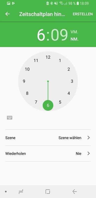 Praktisch ist die Möglichkeit, Szenen per Zeitschaltung automatisch zu planen. Allerdings ist die Funktion längst nicht so flexibel wie bspw. ein gestellter Wecker in der Uhr-App des Smartphones. Eine Wiederholung ist entweder stündlich, täglich oder wöchentlich möglich – nicht aber nur an ausgewählten Wochentagen passend zum Wecker.