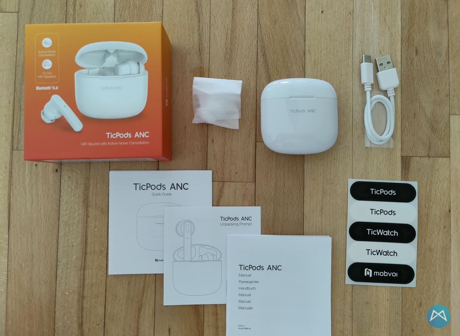 Im Lieferumfang befinden sich die TicPods ANC selbst, ein Ladecase in weiß, ein paar zusätzliche Aufsätze, um die Ohrstöpsel an die verschiedenen Gehörgänge anzupassen, ein USB zu Typ-C-Kabel, ein bisschen Papierwerk und ein paar kleine Aufkleber.
