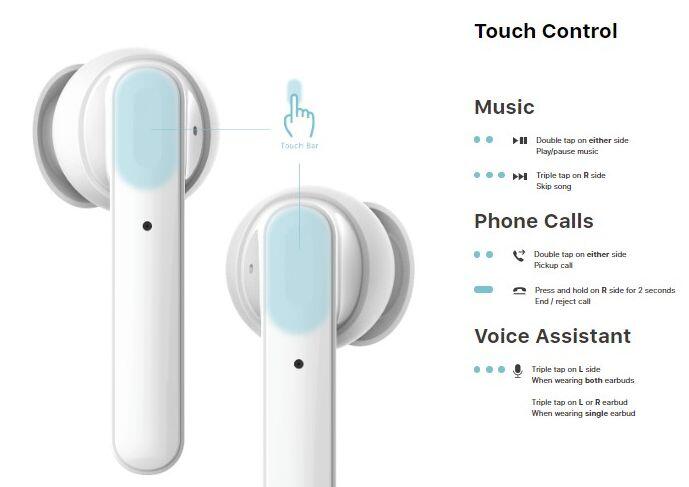 Wie bei Mobvoi schon länger üblich, werden die Kopfhörer über Touch-Gesten gesteuert. Auch die TicPods ANC machen hier nicht halt. Allerdings gibt es eine Änderung. Der steuerbare Bereich ist nun nur noch ein kreisförmiger Bereich und reagiert nicht mehr auf Wischen entlang des Kopfhörers, sondern nur noch auf Tippen am oberen Ende des langen Teils.