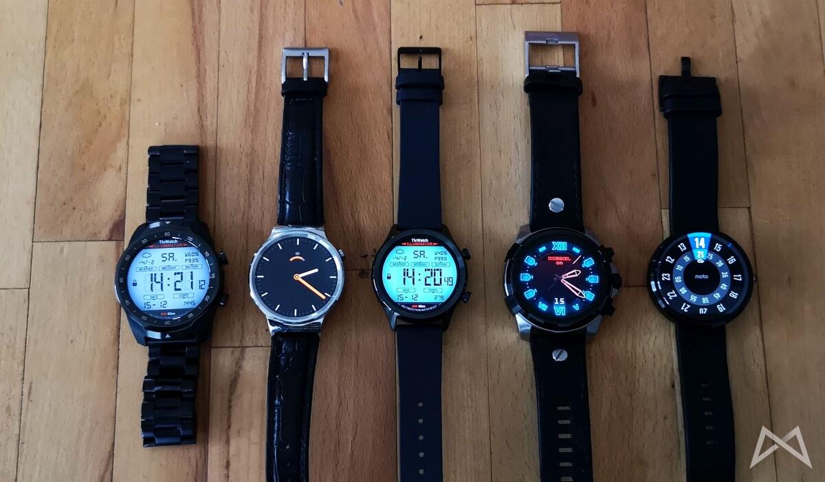 Am Wochenende kam ich auch dazu mal die komplette Sammlung aus Casa Meidl nebeneinander zu drapieren. Dabei finden wir von der Moto 360 mit ihrem großen Display, aber schlechtem Prozessor und Flat Tyre auch eine Huawei Watch, die lange Zeit mein Favorit war und noch eine Diesel FullGuard.