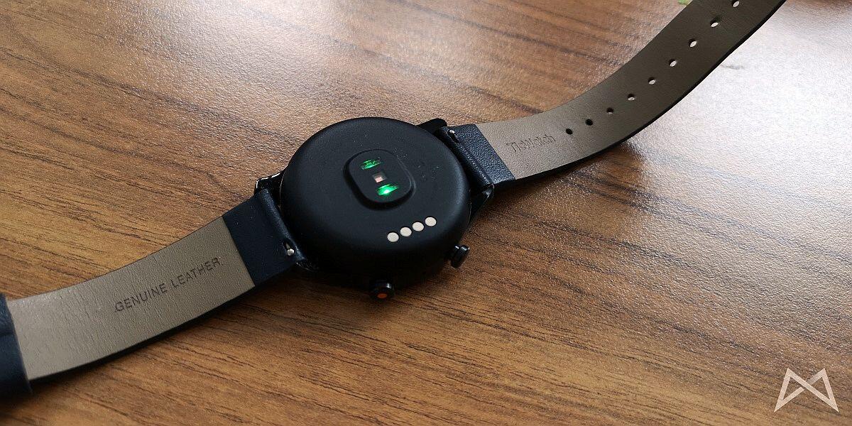 Auf der Rückseite hat die C2 den Herzfrequenzmesser und die Pins für das Ladedock. Letzerer hält magnetisch die Ladestation an der richtigen Position an der Uhr fest. Das klappte in meiner Testzeit auch prima und fast jedes Mal direkt beim ersten Versuch die Uhr anzudocken.