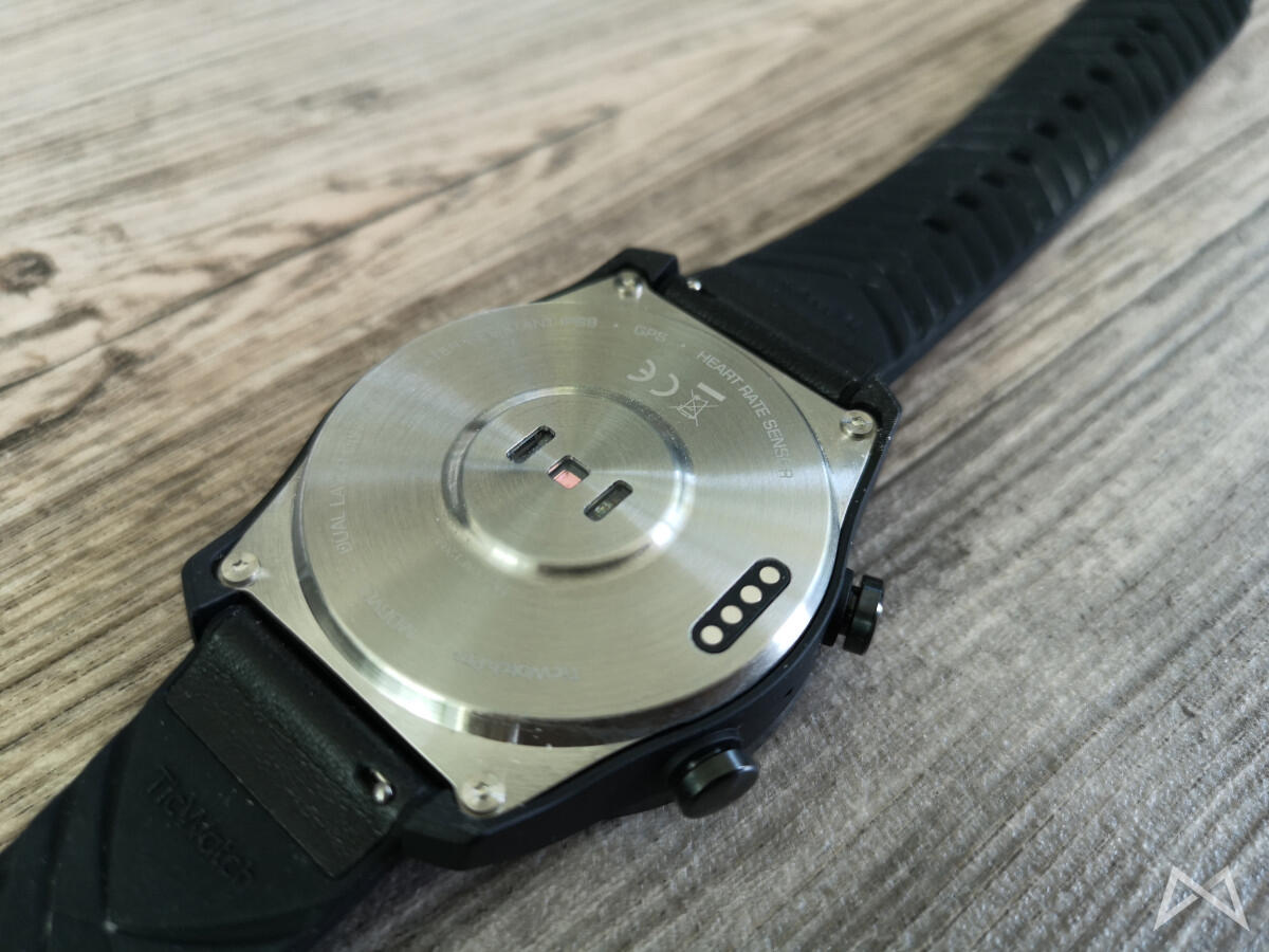 Die Unterseite ist aus silbernen Metall, was dazu führt, dass die Smartwatch auch bei einem seitlichen Blick darauf nicht zu sehr aufträgt. Auf eben dieser Unterseite finden wir auch den Pulsmesser, welcher nicht dauerhaft misst, sondern bei Bedarf aktiviert werden muss. Dies ist zum einen verständlich (sonst hoher Akkuverbrauch) und zum anderen aber vielleicht gerade für Sportler eher ein Nachteil.