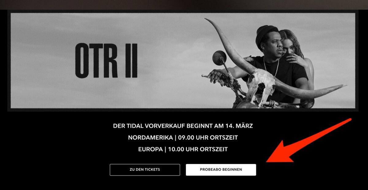 Das Angebot findet man auf der Webseite von Tidal, jedoch nicht beim Probeabo ganz oben, sondern etwas weiter unten. Dort wird die OTR II Tour von Jay-Z und Beyoncé beworben und auch dort findet man einen Link für ein Probeabo.
