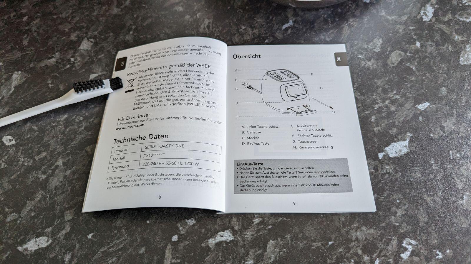 Der Lieferumfang ist nicht unbedingt umfangreich, aber auch nicht größer nötig und so bekommen wir gut verpackt den Toaster selbst, eine kleine Bürste und eine gut bebilderte und deutsche Anleitung ins Haus geliefert.