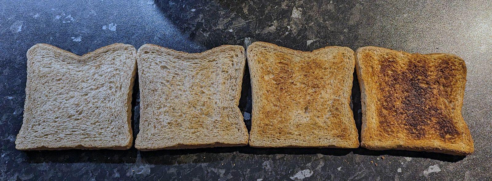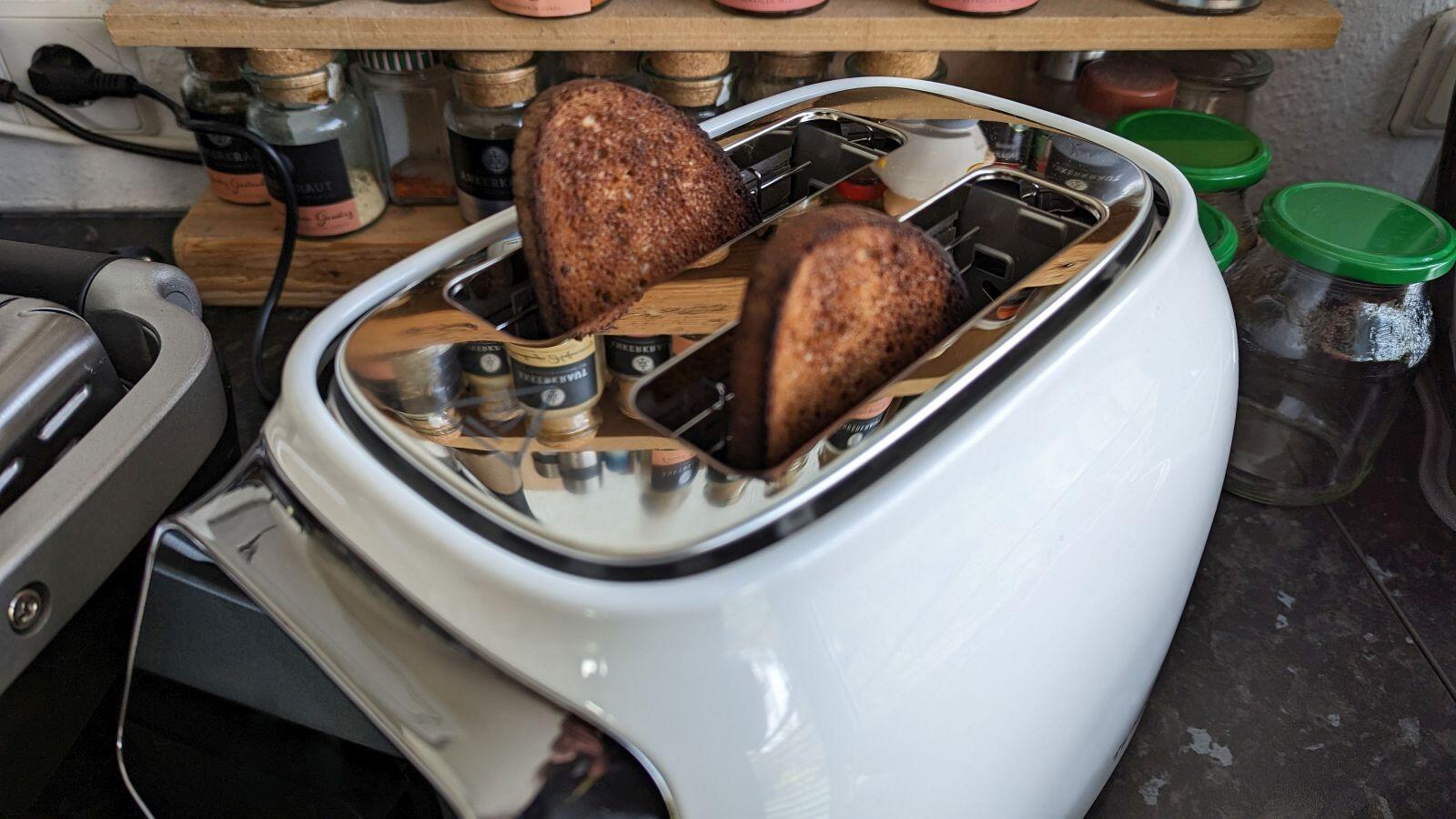 Auf einer Seite blieb die Fortschrittsanzeige irgendwann mittendrin stehen und ich musste nach ein paar Sekunden den Toastvorgang abbrechen, weil der Geruch von zu schwarzem Toast in meine Nase drang. Das Ergebnis war dann auch minimal *hust* zu dunkel. Das passierte aber in mehreren Wochen Test nur einmal.