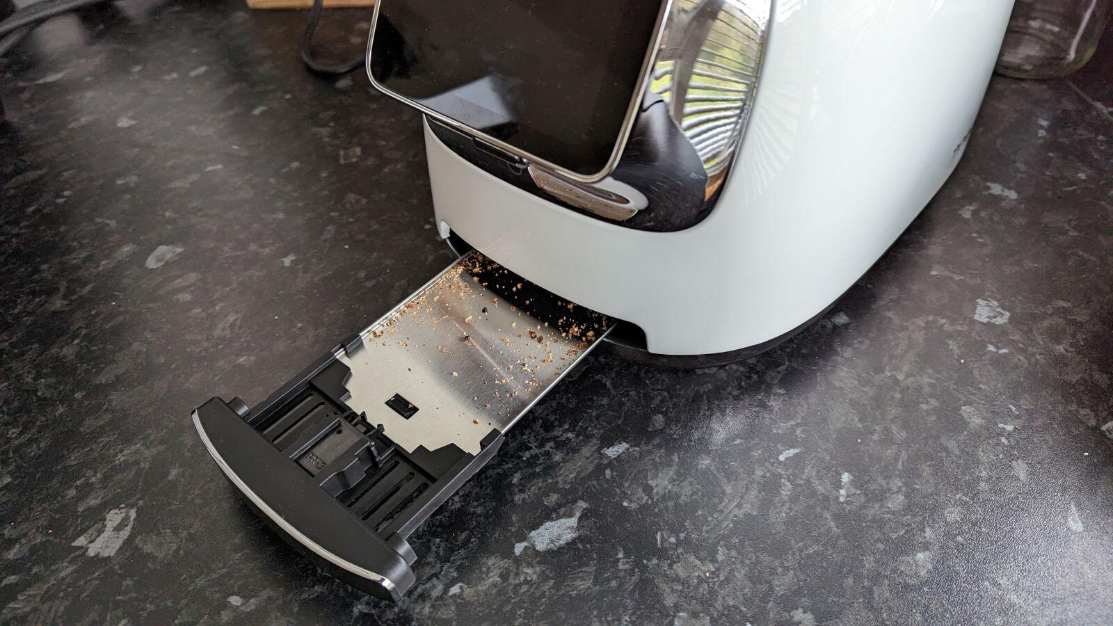 Die Oberseite ist ebenfalls in Chrome gehalten und unterhalb des Displays finden wir noch ein Fach für die Krümelreste. Der Toaster ermahnt übrigens netterweise mit einem kleinen Popup nach bestimmten Intervallen dazu, dass diese Schublade doch bitte geleert werden muss. Alles muss man selber machen! :)
