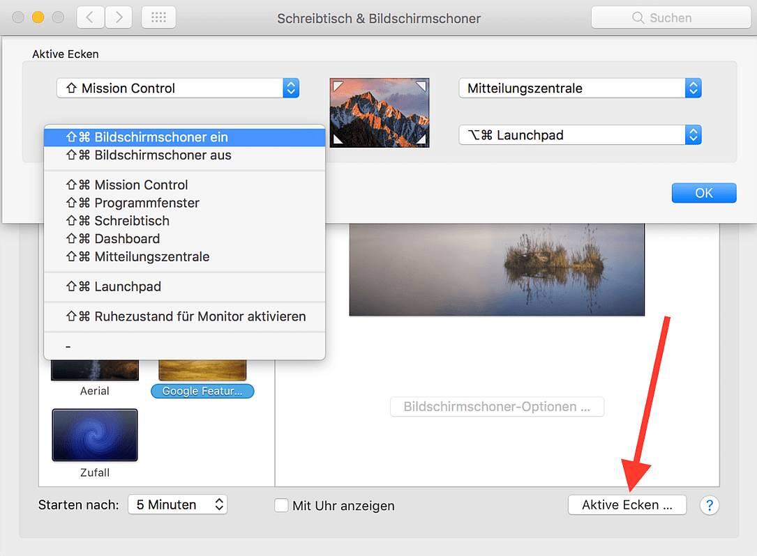 Unter macOS gibt es die Funktion Aktive Ecken. Einmal aktiviert genügt es mit dem Mauszeiger in eine Ecke des Bildschirms zu fahren, um damit beispielsweise sofort den Bildschirmschoners zu starten. Definitiv ein nützliches Feature, welches schnell in Fleisch und Blut übergeht. Die Einstellungen dieser Funktion befinden sich in