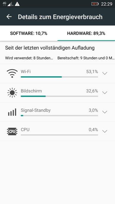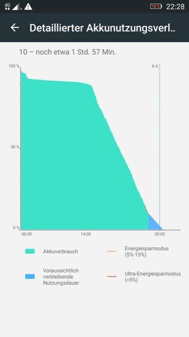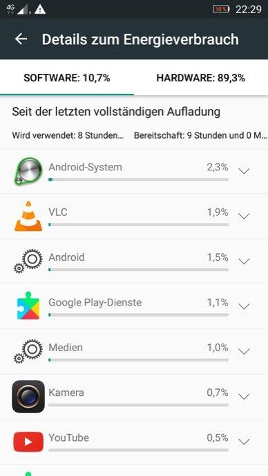 Damit man auch einige Fotos oder lange Snapchat-Sessions machen kann, enthält das Lenovo K6 einen ca. 3000mAh großen Akku, welcher nicht gewechselt werden kann. Dank des recht sparsamen Mittelklasseprozessors, sowie dem „nur“ 5Zoll FHD-Displays ist hierdurch eine Laufzeit von 2 Tagen bei moderater Nutzung kein Problem. Selbst wenn man viel draußen ist, jegliche Funkmodule wie W-Lan, Bluetooth etc. an lässt und zu der Sorte „Smombie“ gehört, sollte man gut über den Tag kommen. Nach etwa 9h Betriebszeit, wovon ca. 8h auf ein Dauervideo im VLC-Player bei ca. 50% Helligkeit entfielen, hatte Akku noch 10% Restladung.