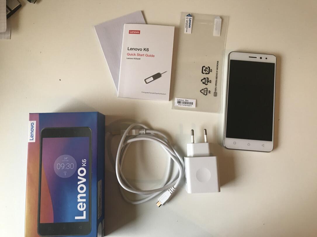 Der Lieferumfang liest sich beim Lenovo K6 recht spartanisch. Neben dem Gerät selbst, liegt der übliche Papierkram (Schnellstartanleitung, Garantiebedingungen etc.) und ein SIM-Tool bei. Ebenso enthalten sind das 10W Netzteil und ein (20cm) langes Ladekabel. Als nette Beigabe ist noch eine Schutzfolie zu erwähnen, welche vom Typ „Kunststoff“ ist.