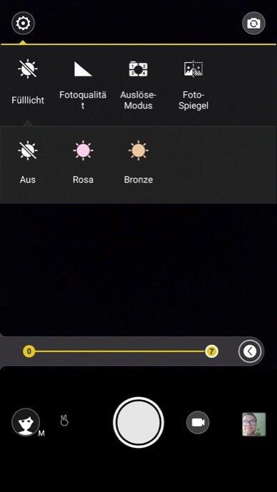 Ähnlich dem Retina Flash beim iPhone hat man auch hier die Möglichkeit ein Füllicht zu aktivieren, was im Dunkeln für die nötige Erleuchtung sorgen soll. Hier hat man aber nur die Auswahl zwischen einem Rosa und einem Bronze-Ton.