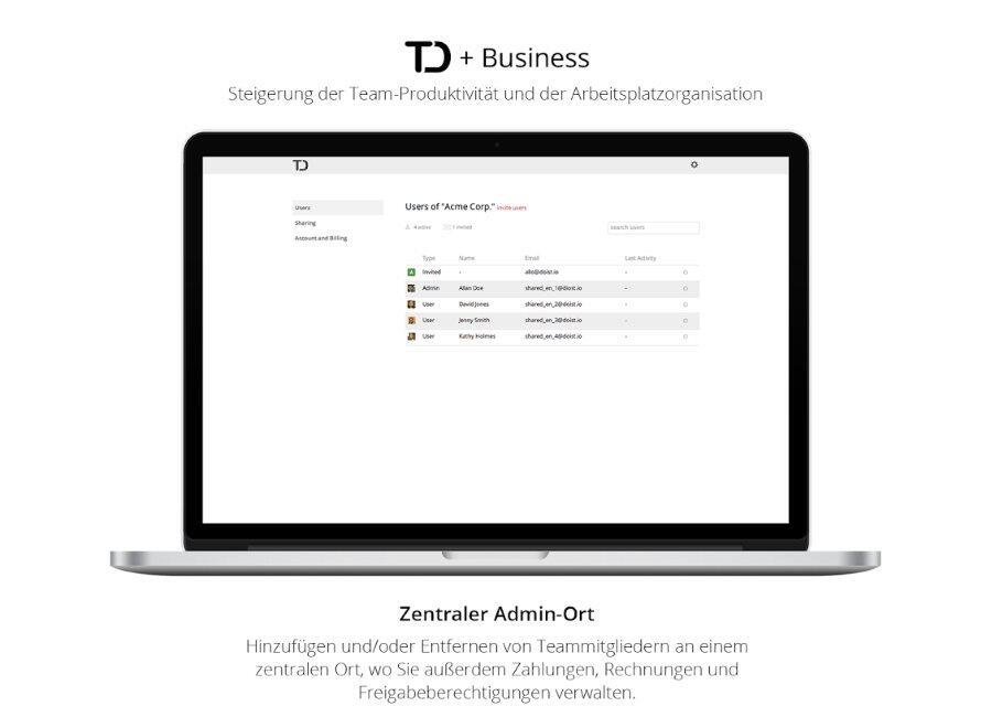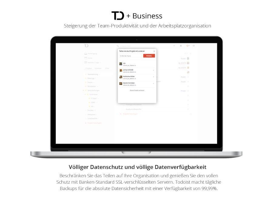 Entscheidet sich ein Unternehmen für Todoist Business, bekommt man einige spezielle Features mit auf den Weg: Der zuständige Administrator hat beispielsweise eine zentrale Administrationsoberfläche, auf der Nutzer hinzugefügt und entfernt werden können, des Weiteren können dort Zahlungen und Rechnungen eingesehen sowie verwaltet werden. Einen gemeinsamen Team-Posteingang mitsamt einfacher Aufgaben-Delegierung per Name statt E-Mail-Adresse gibt es genau so wie Benachrichtigungen per Push, SMS und E-Mail.