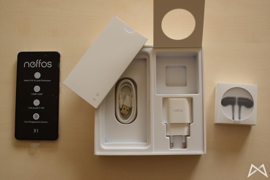 TP-Link hat für das Neffos X1 einen ganz netten Karton mit goldener Schrift entworfen, der vergleichsweise groß ausfällt. Auch der Innenraum wirkt durchdacht und hinterlässt somit einen positiven Ersteindruck. So ist das Smartphone sofort erkennbar, vom weiteren Lieferumfang sind nur die Kopfhörer durch ein Guckloch zu erahnen.