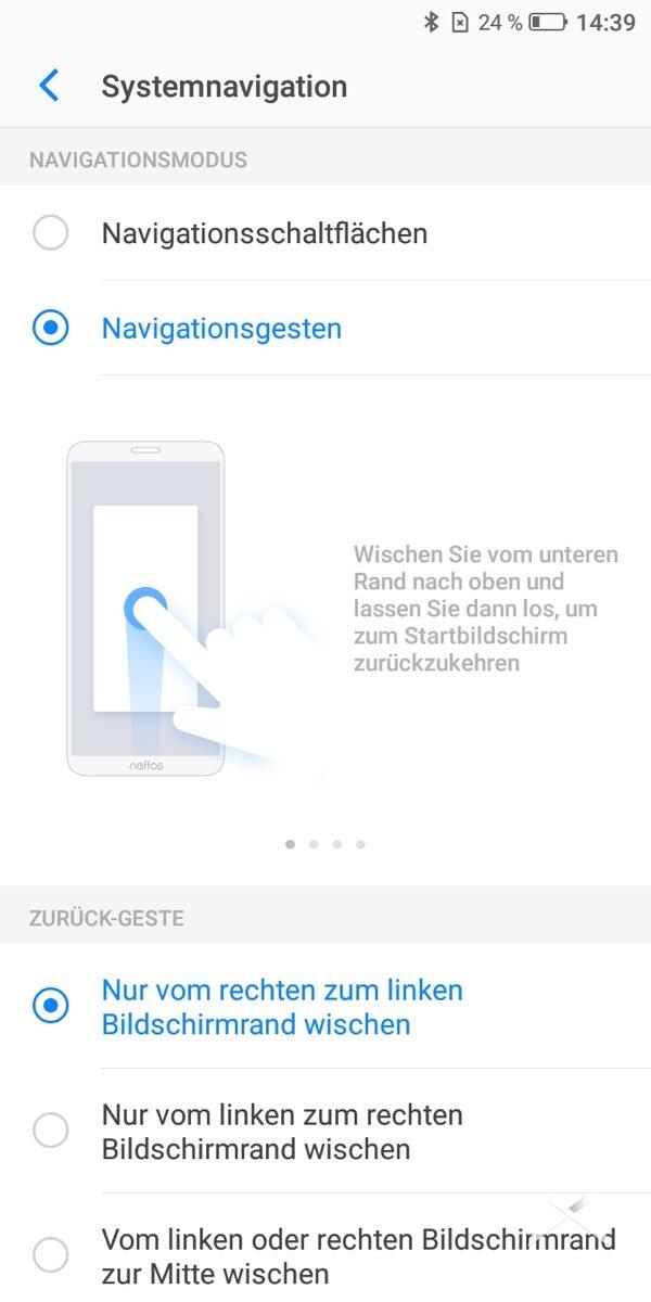 So ist im Neffos X9 eine Gestensteuerung wählbar, weile Gesten wie hochwischen für Home und von rechts reinwischen für Zurück bietet.