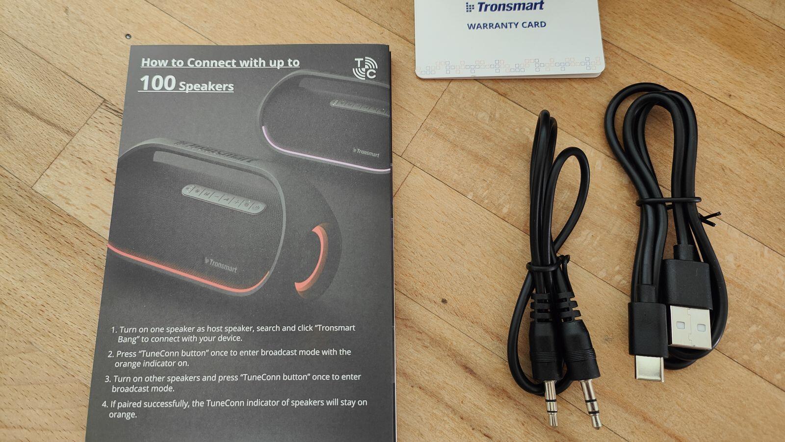 Der Lieferumfang ist überschaubar, aber was soll bei einem Lautsprecher auch groß dabei sein? Wir finden hier jedenfalls eine kleine Anleitung und eine Garantie-Karte nebst einem Klinkenstecker-Kabel, um das Handy ohne Bluetooth mit dem Speaker zu verbinden und ein USB-A-Kabel zu Typ-C zum Aufladen des Lautsprechers.