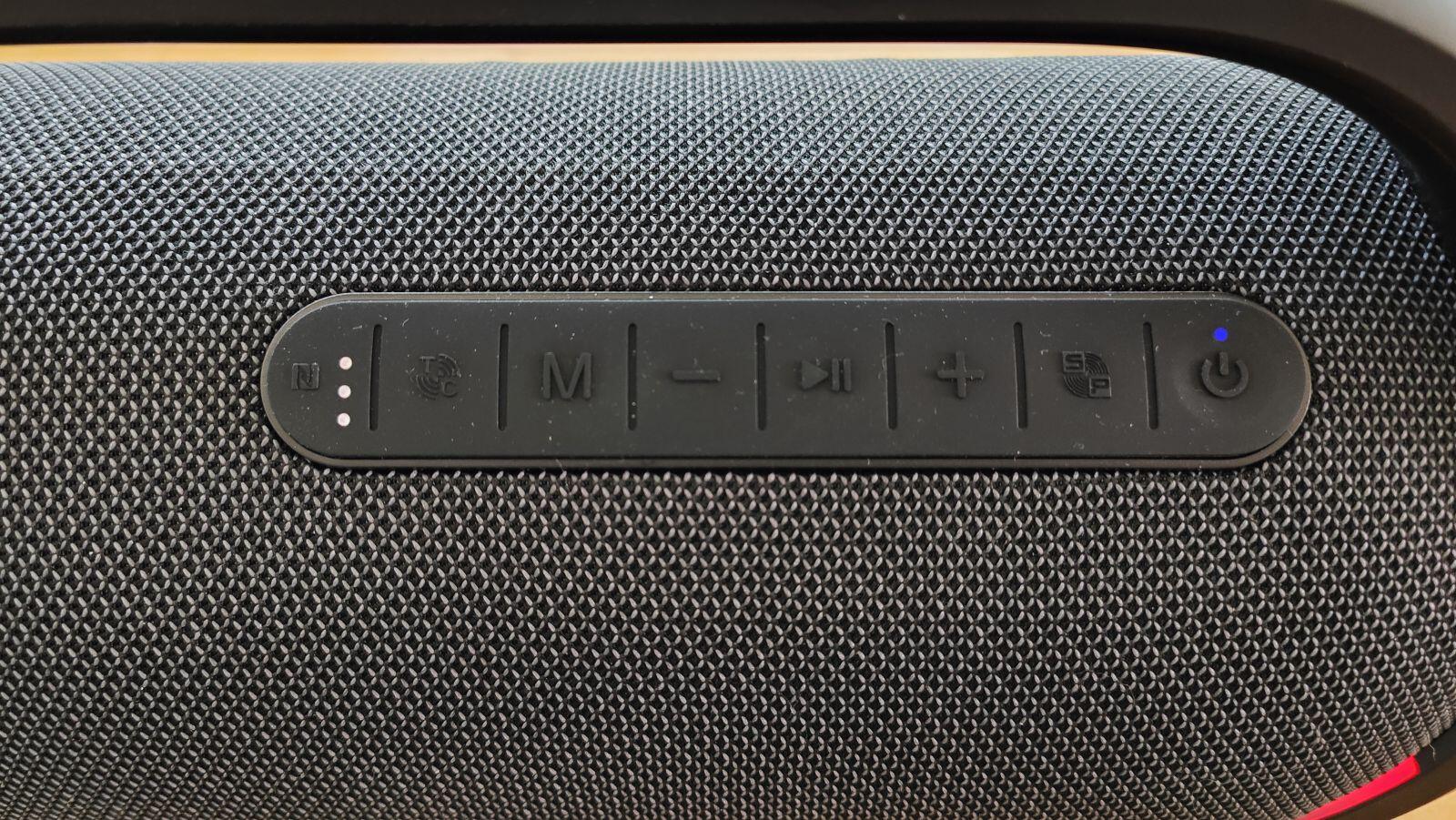 Ganz links ist ein NFC-Tag, damit das Smartphone ganz einfach durch Hinhalten via Bluetooth verbunden werden kann. Dann gibt es die M-Taste zum Wechseln zwischen Bluetooth, AUX, MicroSD-Karte etc. und die Lautstärke und Play/Pause-Taste. Daneben finden wir noch eine Taste, um weitere Tronsmart Speaker zu koppeln und den Power-Button, um den Lautsprecher ein/auszuschalten oder die LED-Beleuchtung zu ändern oder zu deaktivieren.