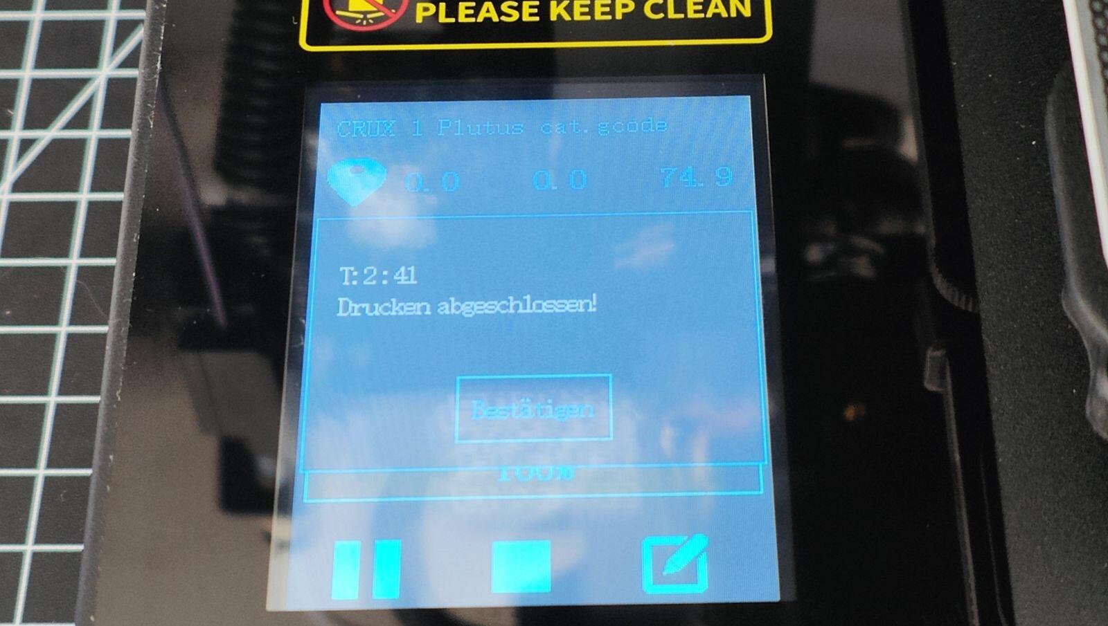 Durch einen Fehler von mir in Tinkercad musste ich den Text auf dem Schild dann aber noch extra ohne weiße Unterlage drucken und dann mit Sekundenkleber aufkleben. Dennoch zeigt auch der Text, dass der CRUX-1 auch bei filigranen Schriften ohne Layer unterhalb der Schrift keine Probleme mit dem Druck hatte.