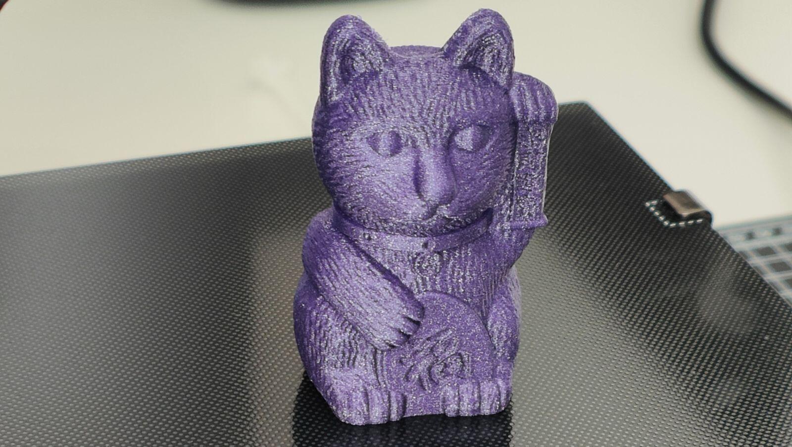 Auch vorher haben die Drucke auf der beschichteten Glasplatte gehalten, aber die Klammern zur Befestigung nehmen vom 18x18cm Druckbett noch jeweils rechts und links einen Zentimeter weg und ich finde auch, dass sich Drucke viel besser auf einer PEI-Platte lösen und während des Drucks viel besser darauf halten. Die Katze oben ist im Live Unboxing und Zusammenbau auf TikTok noch mit der orig. Glasplatte entstanden. Selbst auf 200 % Geschwindigkeit hielt das Demo-File noch gut auf der Platte.