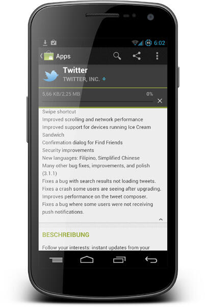Nach dem letzten Update häuften sich die Fehlermeldungen über diverse Probleme mit der Twitter-Anwendung für Android-Geräte. Die Bilder-Vorschau funktionierte nicht mehr richtig und auch der Push-Dienst der Nachrichten lief zumindest auf meinem Galaxy Nexus um einiges schlechter und unzuverlässiger als in der vorherigen Version.