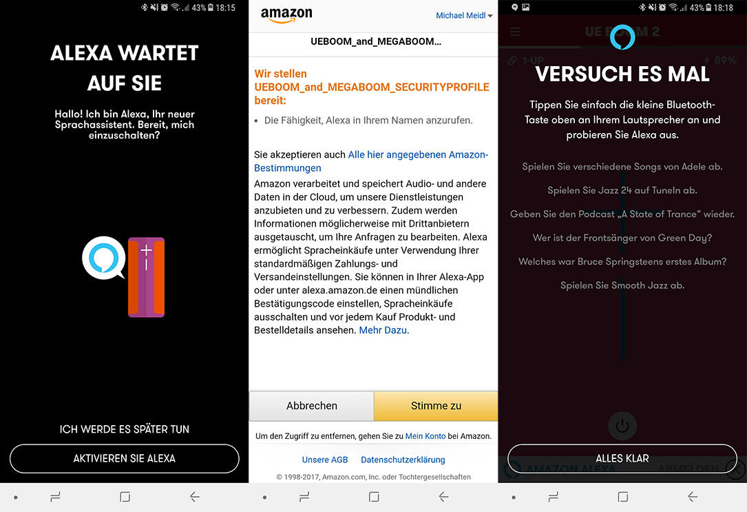 Danach öffnet ihr die App und aktualisiert die Firmware der Lautsprecher. Um den Dienst zu aktivieren, müsst ihr dann die Bluetooth-Taste auf dem UE-Lautsprecher drücken. Danach könnt ihr mit Alexa sprechen. Der Dienst lässt sich aber nicht über einen Sprachbefehl aktivieren, wie man das vom Echo kennt.