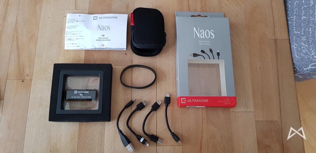 Umso kleiner der NAOS ist, umso größer ist dessen Lieferumfang. Damit möglichst viele Abspielgeräte angesprochen werden können, ist abgesehen vom NAOS selbst und einer kleinen Anleitung ein kleines Täschchen im Lieferumfang.