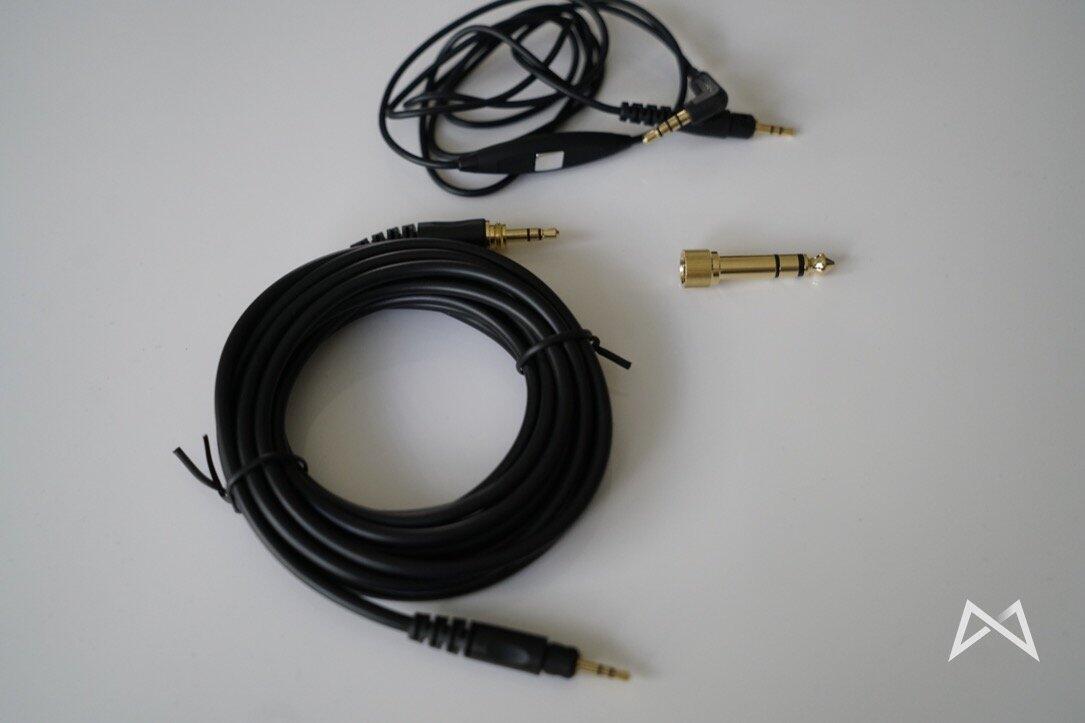 Abgesehen vom Papierwerk finden wir auch noch ein weiteres, deutlich robusteres, Verbindungskabel mit 3m Länge und mit je 3,5 mm Klinke plus einem Aufschraub-Adapter für 6,3 mm im Lieferumfang.