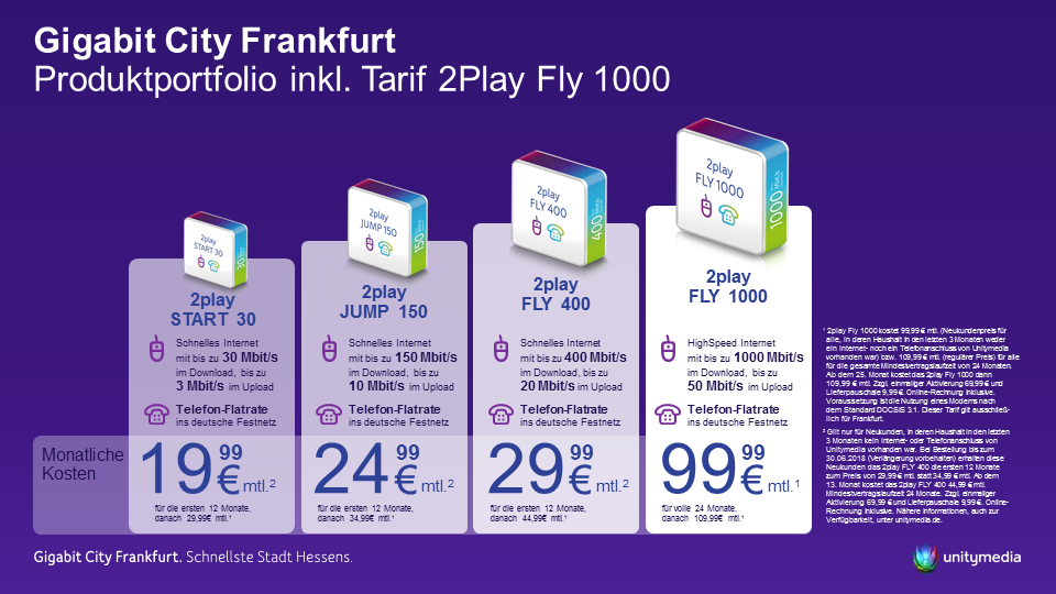 Für das neue Angebot hat Unitymedia in den vergangenen Monaten sein Kabelnetz in Frankfurt mit gigabitfähigen Netzelementen ausgestattet, den neuen Daten-Übertragungsstandard DOCSIS 3.1 implementiert und für die Kunden aktiviert.