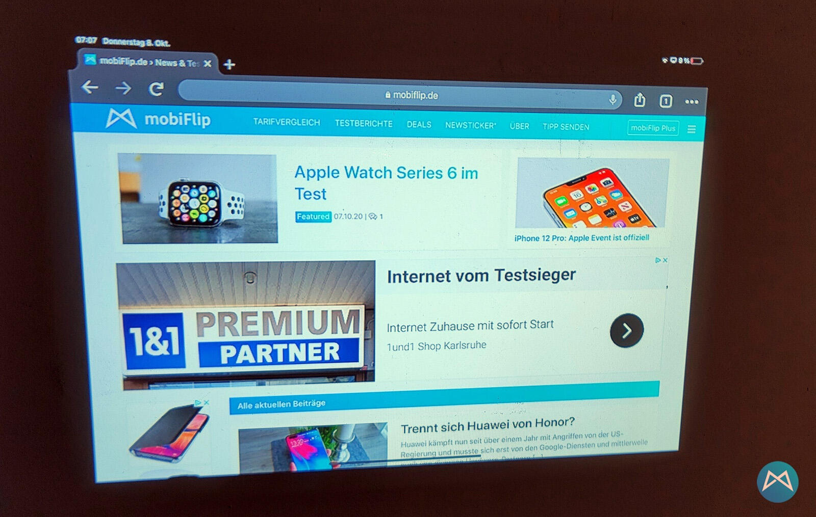 Der USB Typ-C Port ist für die Stromversorgung gedacht. Es kann hier also nicht einfach ein aktuelles Smartphone o. .ä. via Typ-C angeschlossen werden. Ein Adapter von Typ-C zu HDMI konnte ich dann aber anstandslos nutzen, um das Signal vom Smartphone (Oppo Find X2 Pro) und auch das Signal vom iPad Pro an den Beamer zu senden.