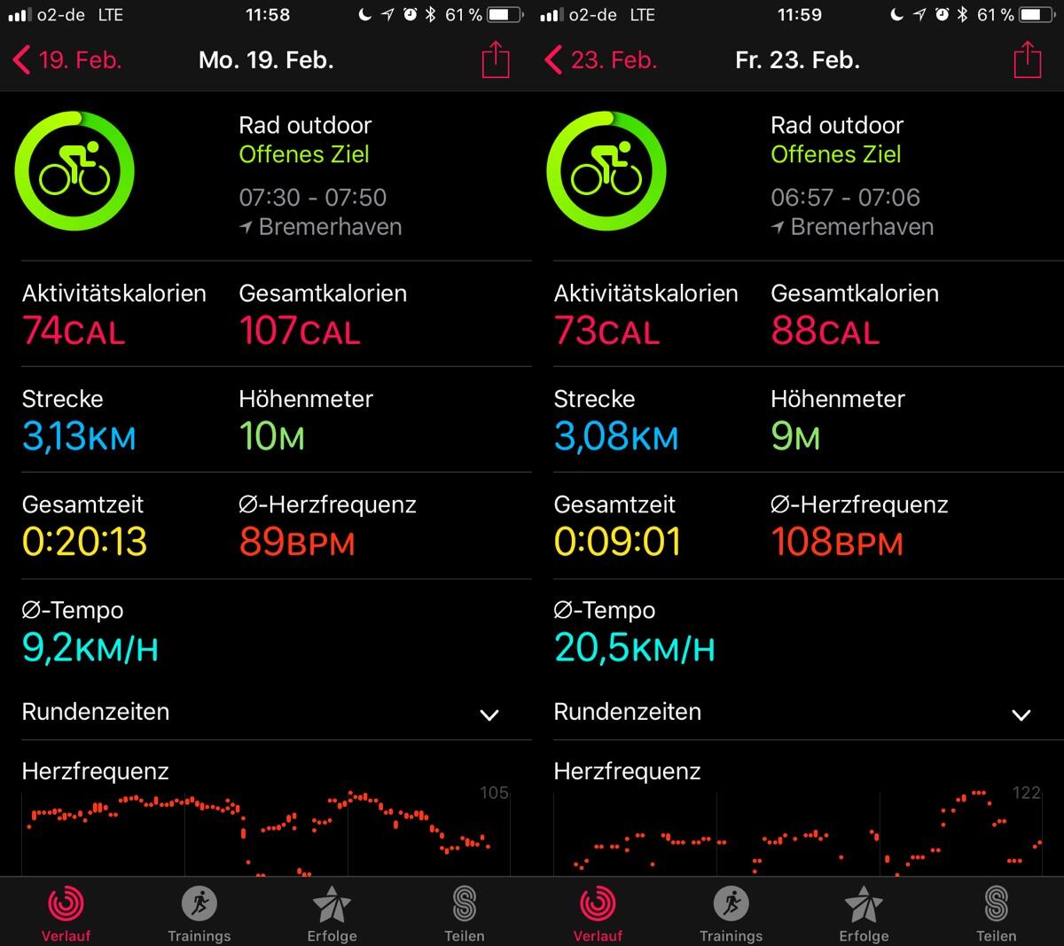 Dafür habe ich das Überholen von plötzlich auftretenden Hindernissen in Form von anderen Radlern perfektioniert. Mein Arbeitsweg glich einem Geschwindigkeitsrausch, achtet mal auf meinen Durschnittspuls vor und während der Testphase auf dem Screenshot.