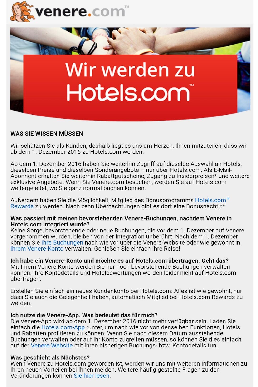 Anschließend wird die italienische Marke Venere voraussichtlich eingestampft, für weitere Geschäfte verweist man auf das Portal Hotels.com. Dieses gehört ebenso wie die Portale Venere, Orbitz und Ebookers bereits jetzt zur Expedia-Gruppe als eine der Branchengrößen. Venere weist darauf hin, dass Accounts nicht automatisch migriert werden, abgegebene Hotelbewertungen gehen wohl verloren. Bestehende Buchungen können natürlich auch weiter eingesehen und verwaltet werden.