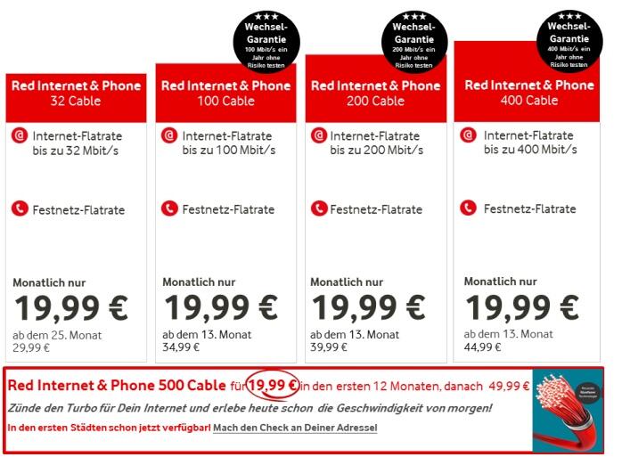 Preislich wird der Tarif „Red Internet & Phone 500 Cable“ etwas über dem 400er-Tarif liegen. Das bedeutet, in den ersten 12 Monaten werden 19,99 Euro fällig, danach aber 49,99 Euro monatlich, was 5 Euro mehr als im Red Internet & Phone 400 Cable sind. Eine Telefonie-Festnetzflatrate ist ebenfalls enthalten.