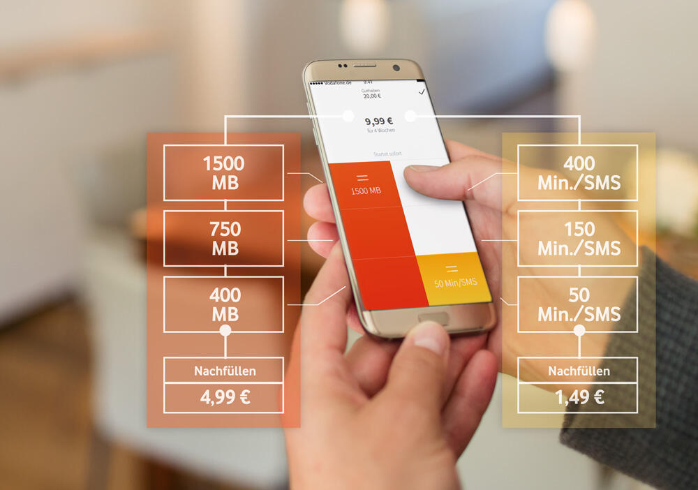 Für den mobilen Internetzugang stehen drei Datenpakete mit 400, 750 und 1.500 Megabyte zur Auswahl. Diese können fürs Surfen mit bis zu 500 Megabit pro Sekunde genutzt werden. Für Sprache und SMS bietet Vodafone wahlweise 50, 150 oder 400 Einheiten. Diese können jeweils für 4,99 Euro bzw. 1,49 Euro wieder nachgefüllt werden.