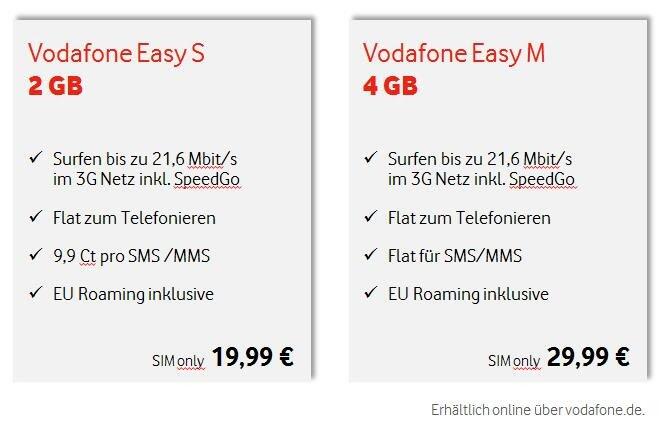 Zum monatlichen Basispreis von 19,99 Euro bietet Vodafone im Tarif Easy S eine Telefonie-Flat und ein zwei Gigabyte großes Datenpaket. Für zehn Euro mehr gibt es im Tarif Easy M doppelt so viel Datenvolumen und eine SMS- & MMS-Flatrate dazu. In der gesamten EU gelten die Tarifleistungen ohne Aufpreis.