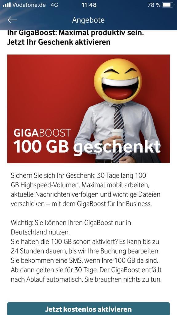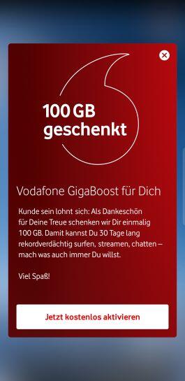 Die Vodafone GigaBoost-Aktion ist in allen Mobilfunk- und Festnetz-Tarifen, SIM only und in allen Substufen gültig. Bei Credit-Kunden wird nach der Aktivierung das Datenvolumen automatisch vergeben.