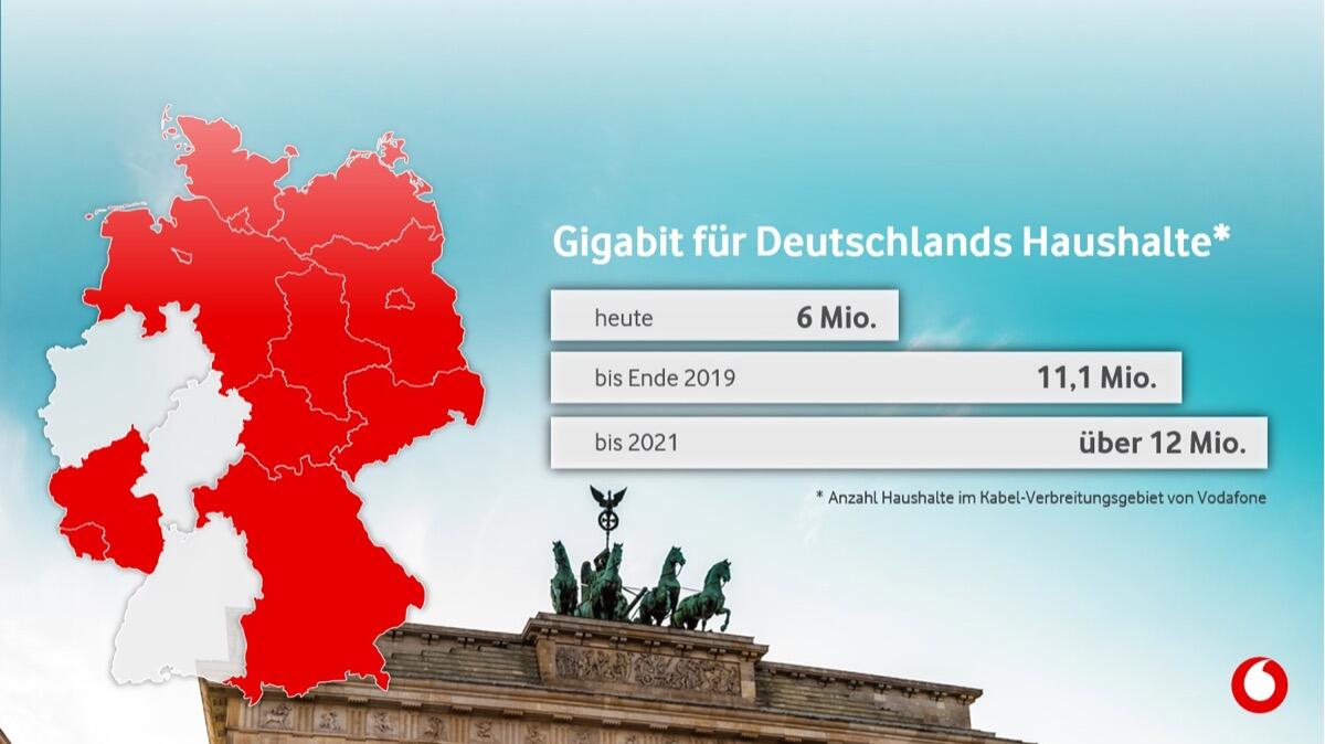 Bis Ende des nächsten Jahres will Vodafone nach eigenen Angaben über 11,1 Millionen Haushalte mit Gigabit-Geschwindigkeit über sein Kabelnetz versorgen. Und bis 2021 sollen es 12 Millionen Gigabit-Anschlüsse im nahezu gesamten Kabelverbreitungsgebiet sein.