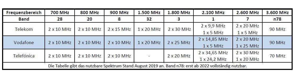 Die nachfolgende Tabelle (PDF-Download) zeigt das den drei deutschen Netzbetreibern Telekom, Vodafone und Telefónica zur Verfügung stehende Frequenzspektrum.