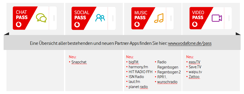 Ab sofort kommen weitere 15 Partner-Apps zu Vodafone Pass hinzu. Darunter sind zum Beispiel bigFM, Snapchat, HIT RADIO FFH, laut.fm, waipu.tv, Zattoo und mehr.