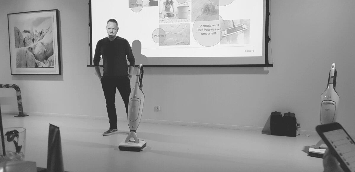 Unter anderem erklärte dort in schickem Ambiente Chefdesigner Uwe Kemker (Zweite Person von links – kennen wir schon von der VR200 Präsentation) die Strategie und die grafischen Elemente der Vorwerk/Kobold-Produkte.