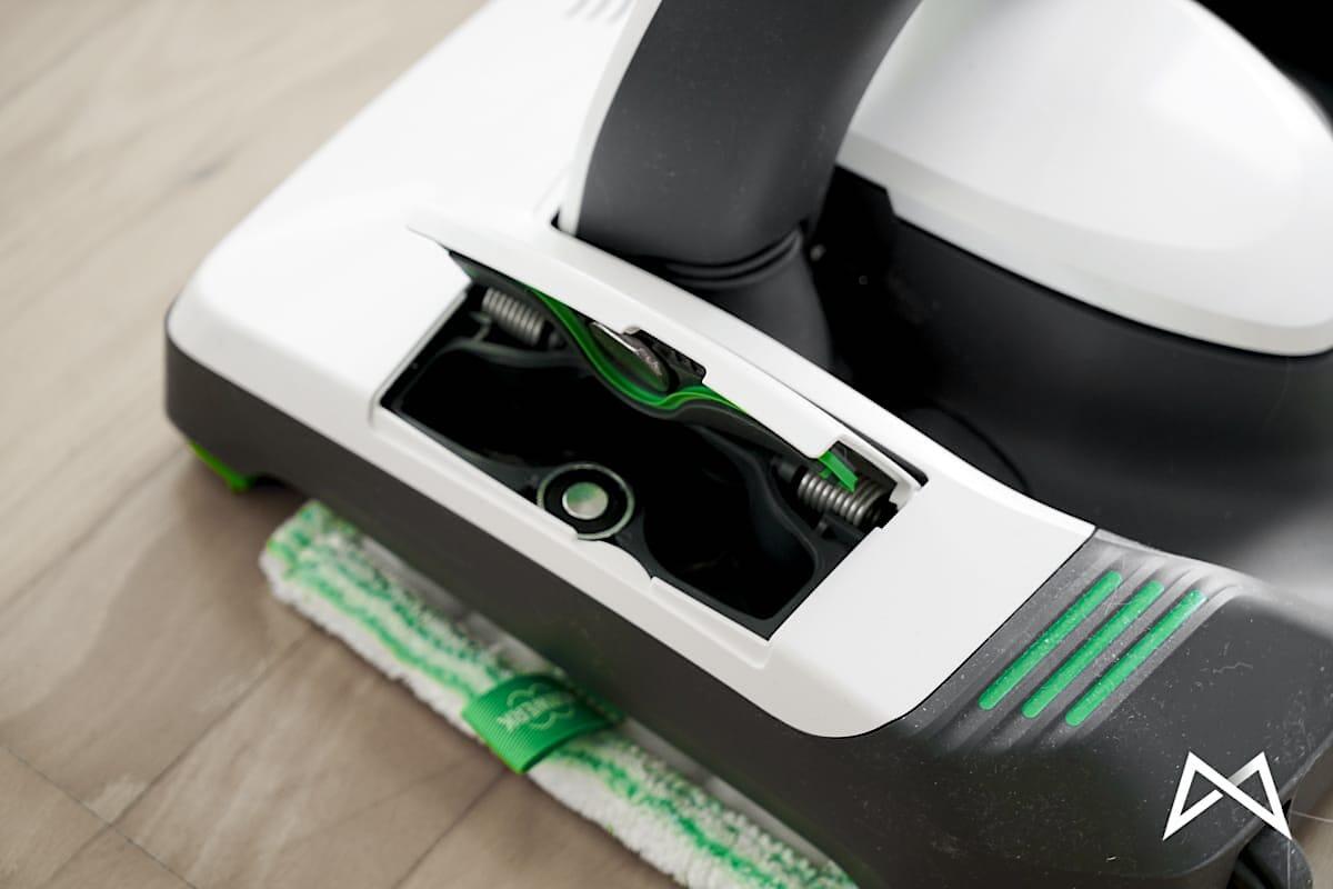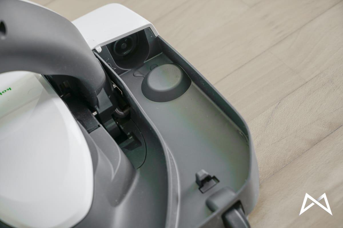 Der SP600 wird lediglich auf den VK200 Handstaubsauger (oder den VT300 Bodenstaubsauger) aufgesteckt und ein Microfasertuch eingeklemmt. Dann noch 3ml Reinigungsflüssigkeit mit ca. 250ml Wasser in einen Tank gefüllt und es kann auch schon losgehen. Auf der Unterseite befinden sich vor und hinter dem Microfasertuch die Öffnungen für den Sauger.